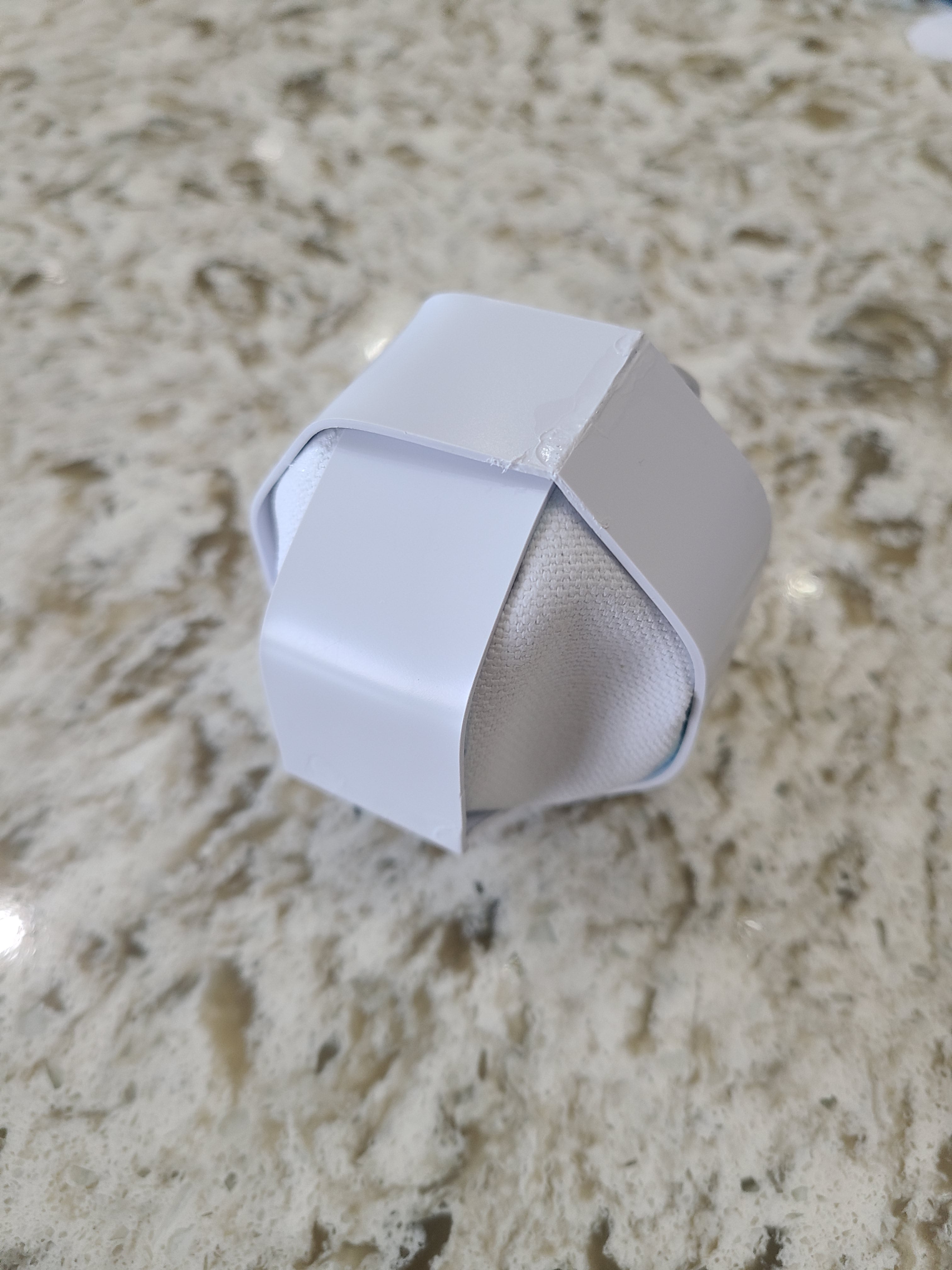 I made equal 7 folds per each polystyrene sheet to make 8 1" by 1" squares that could be bent into a honey-comb shape. Using a hairdryer, I positioned the heat onto the creases to create deeper folds. I used methyl adhesive to connect each strip end to end, and then placed the two pieces interwining together to create a 3D form with double sided tape. I then used glue to fill in the gaps in the honeycomb shape with the oval cutouts of the cotton canvas.